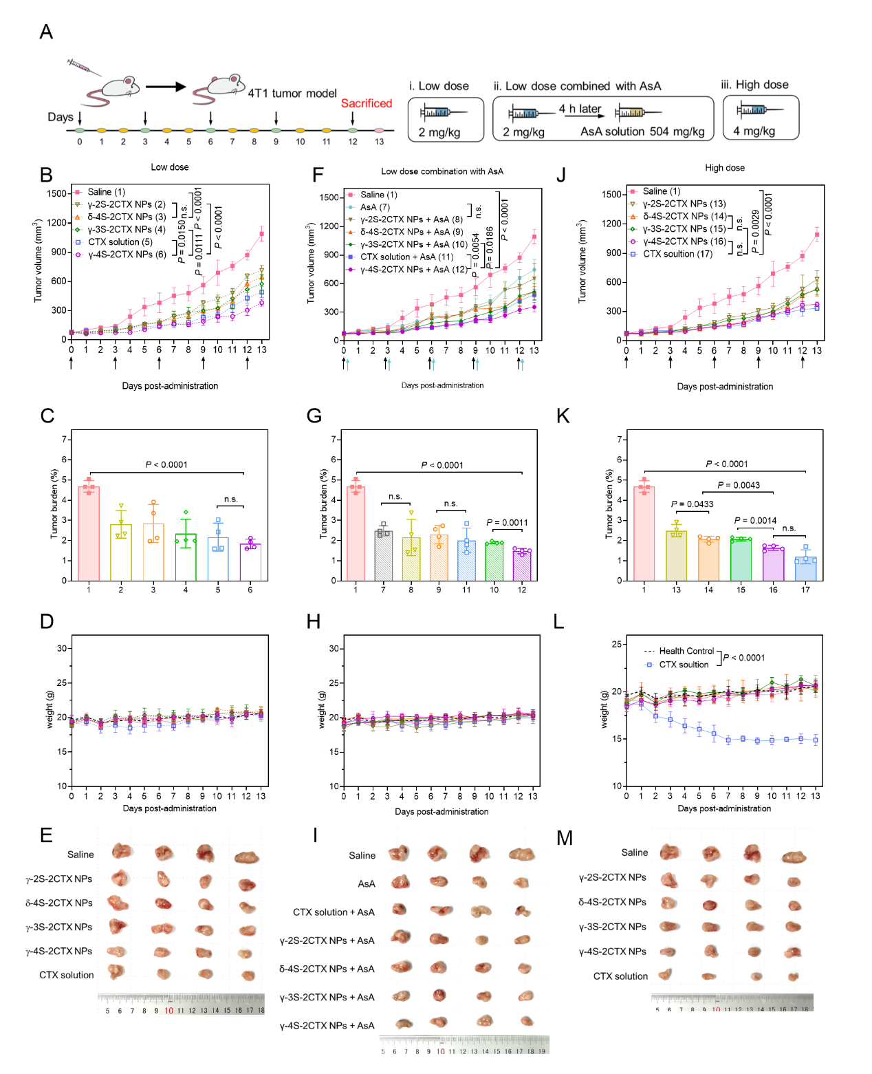 体外细胞试验(图5)显示,由于具有更强的激活选择性,γ-4S-2CTX NPs表现出了更强的抗肿瘤活性和肿瘤细胞选择性。此外,作者提出“火上浇油”策略,通过补充外源性还原物质进一步增强肿瘤还原应激,提高前药自组装纳米粒的抗肿瘤作用。结果表明,“火上浇油”策略成功地激发了四硫键连接的DPNAs的治疗潜力,并具有良好的安全性。