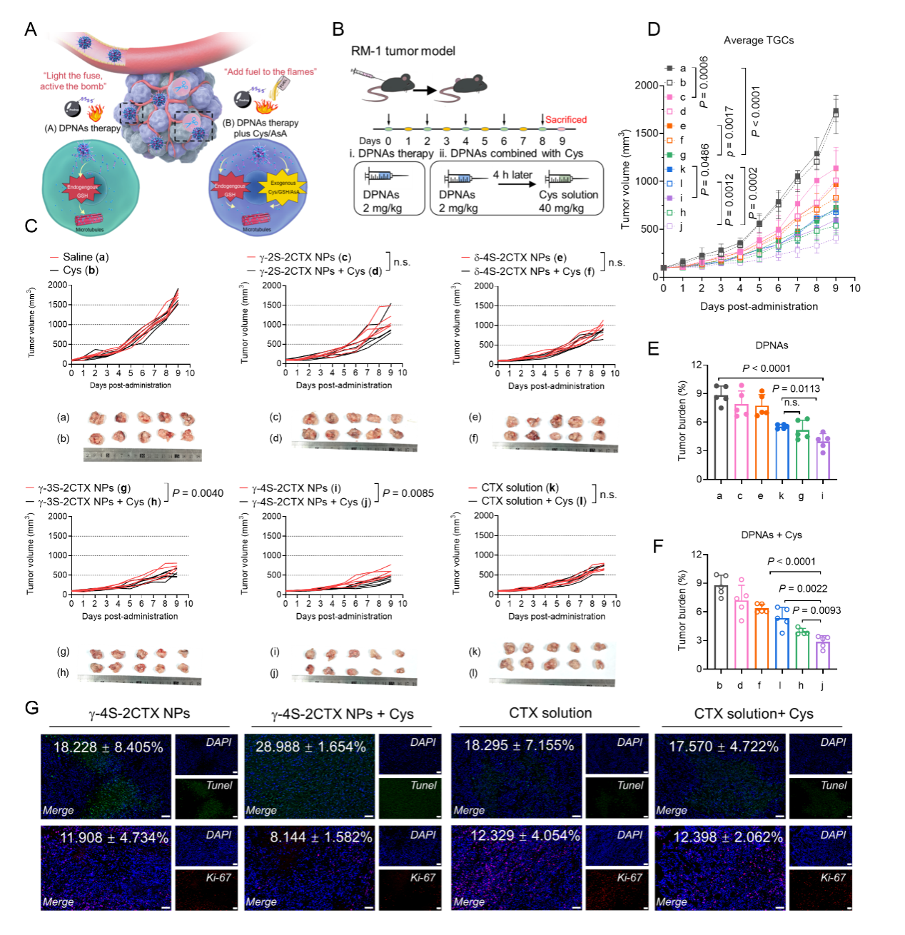 图6. 四硫键桥连前药自组装纳米粒单独及联合外源还原剂的体内抗肿瘤作用(前列腺癌模型:RM-1)