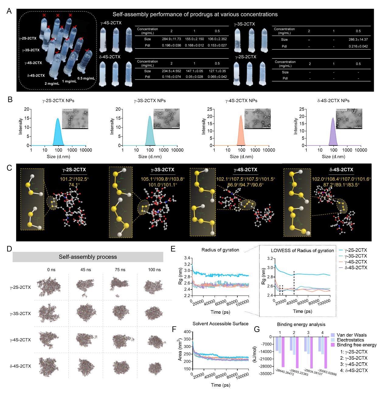 作者首先合成了一系列卡巴他赛二聚体前药,并对其化学稳定性及组装能力进行考察。结果表明,四硫键的引入使DPNAs在自组装方面具有明显优势,这对提高药物递送效率非常重要。通过对组装机制的探索,揭示了卡巴他赛二聚体前药结构-组装关系,解释了四硫键桥连DPNAs具有更好自组装稳定性的机制(图2)。