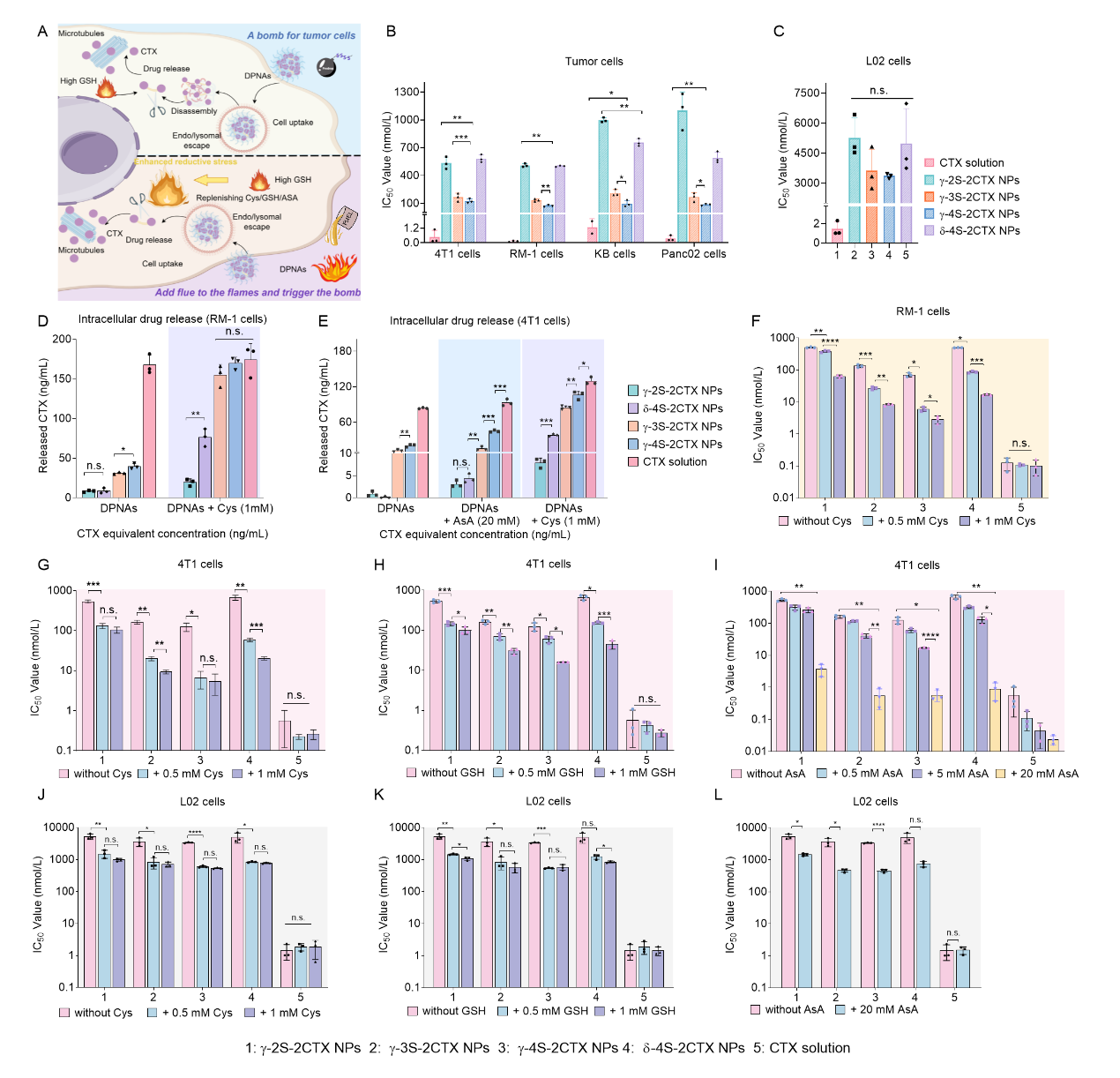 在这项研究中(图1),作者设计了一系列四硫键桥连卡巴他赛(CTX)二聚体前药,系统地考察了四硫键的化学位置对于DPNAs的影响。在综合化学稳定性和激活选择性等因素后,选择了最具潜力的γ-4S-2CTX,并设计了相应二硫键/三硫键桥连前药作为对照。与三硫键和二硫键相比,四硫键赋予DPNAs更强的自组装能力,保证了DPNAs在体内的稳定性。值得注意的是,四硫键具有超高还原反应性,使DPNAs成为高选择性的“肿瘤炸弹”,可以被肿瘤部位的高水平GSH选择性“引爆”,释放毒性CTX杀伤肿瘤细胞。此外,该团队还提出了一种“火上浇油”的策略,通过补充外源还原剂来进一步加强肿瘤部位的还原应激,加速γ-4S-2CTX NPs的活化,从而获得更好的抗肿瘤效果,并同时提高了其肿瘤选择性。