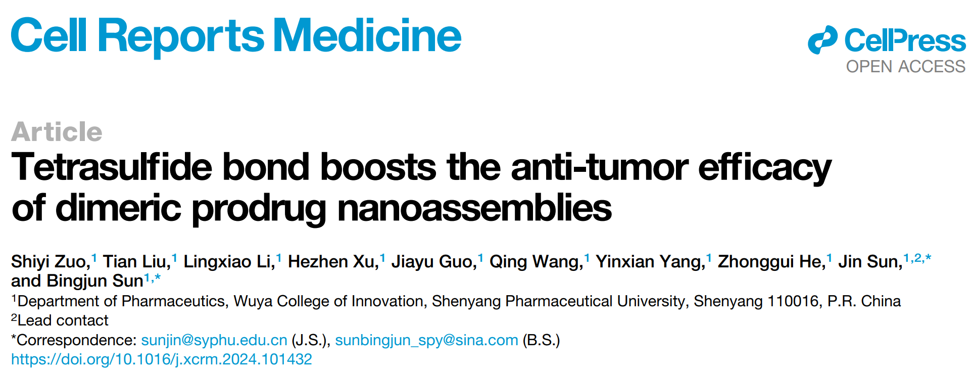 2024年2月21日,bv伟德中国官方网站孙进/孙丙军团队在Cell旗下子刊《Cell Reports Medicine》(IF=14.3)发表题为“Tetrasulfide bond boosts the anti-tumor efficacy of dimeric prodrug nanoassemblies”的研究文章,进一步探讨四硫键在构建前药自组装纳米递送系统中的应用。bv伟德孙进教授和孙丙军教授为此文通讯作者,2021级博士生左诗意为第一作者,bv伟德中国官方网站为唯一通讯单位。