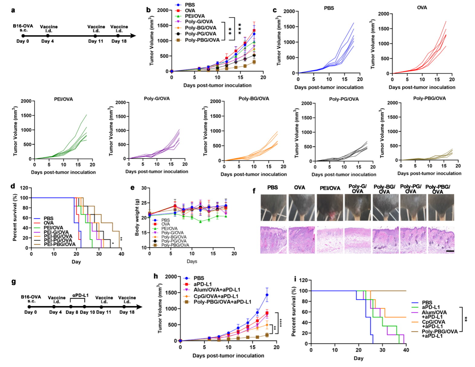 为了进一步验证 PolyGu NV 诱导的特异性抗肿瘤免疫作用,作者研究了它们在表达模型抗原 OVA (B16-OVA) 的黑色素瘤小鼠模型中的治疗效果。 结果显示,用PolyGu NVs免疫的小鼠,尤其是用PG NVs和PBG NVs免疫的小鼠,肿瘤生长率显着降低,这显着提高了小鼠的存活率。 此外,这些疫苗还展示良好的体内安全性。 由于Poly-PBG NVs的良好应用潜力,作者进一步将Poly-PBG NVs与PD-L1抗体结合,并将其与市售佐剂进行比较,结果显示, Poly-PBG NVs 和 PD-L1 的组合优于 CpG/OVA 和 PD-L1 的组合。