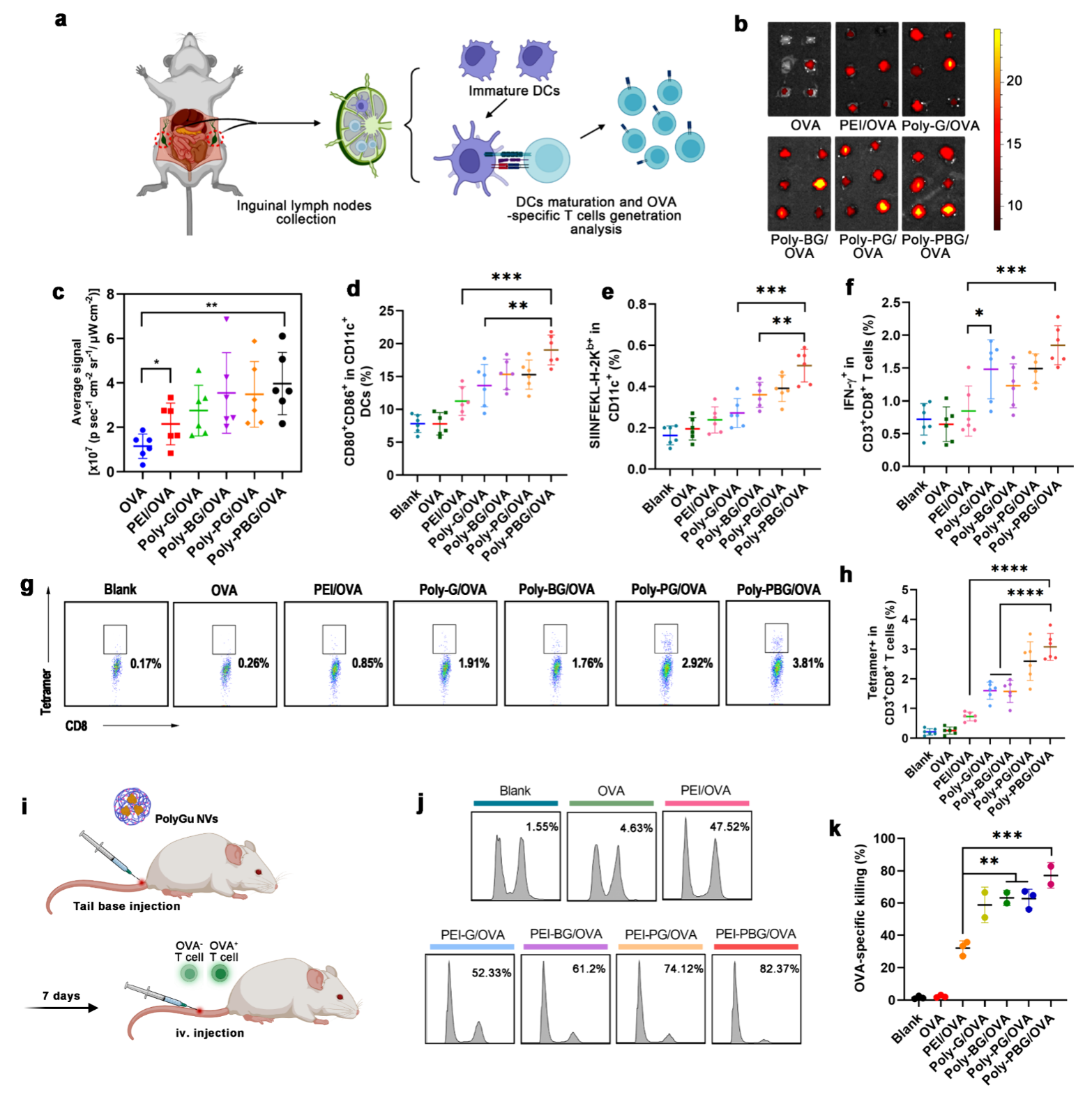 图4. PolyGu-NV 的体内淋巴结靶向和抗原特异性 T 细胞诱导。