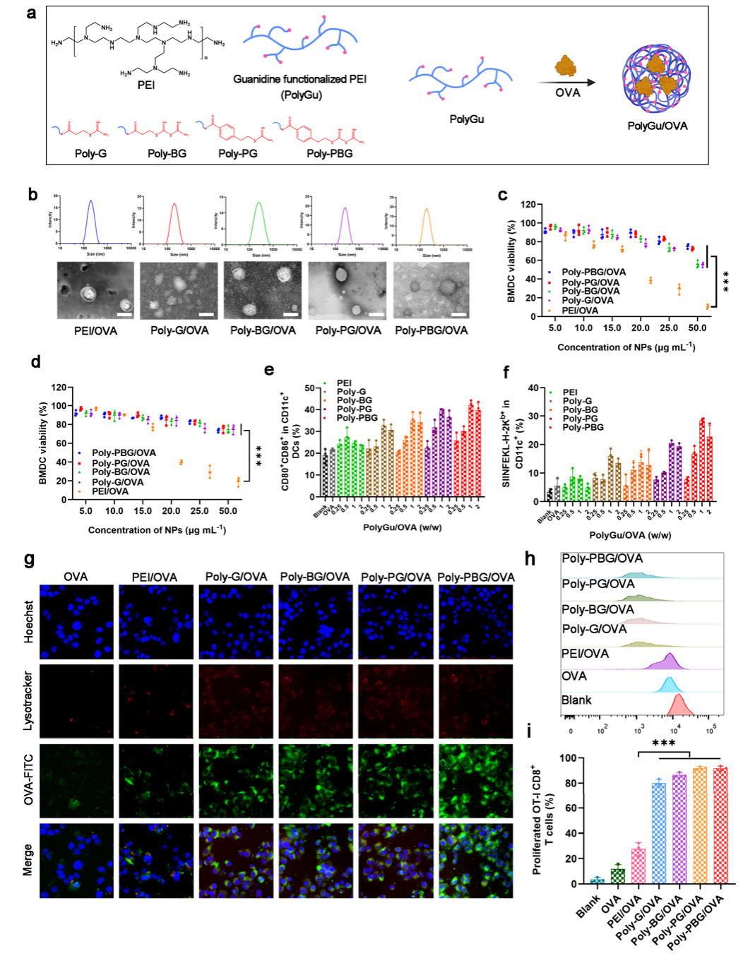 作者首先选择支链PEI作为主要框架,并用功能性胍基团对其进行修饰来构建多胍材料。随后,使用卵清蛋白 (OVA) 作为模型抗原制备了纳米疫苗。首先,作者使用小鼠骨髓来源性树突状细胞 (BMDC) 和巨噬细胞 (BMDM) 检查了胍修饰对 PEI 毒性的影响。结果显示,胍修饰大大减轻了 PEI 的毒性。进一步研究了胍 纳米疫苗对 BMDC 的免疫刺激作用。 结果发现,多胍NVs 可促进 DC 成熟,其共刺激分子 CD80 和 CD86 在 BMDCs 中显着上调,此外,多胍疫苗在促进 DC 抗原呈递方面也表现出更好的效率。这些免疫激活的提升可能与良好的摄取有关。在NVs 处理 DCs后,DCs在刺激 T 细胞增殖方面表现出显著提升的效率。