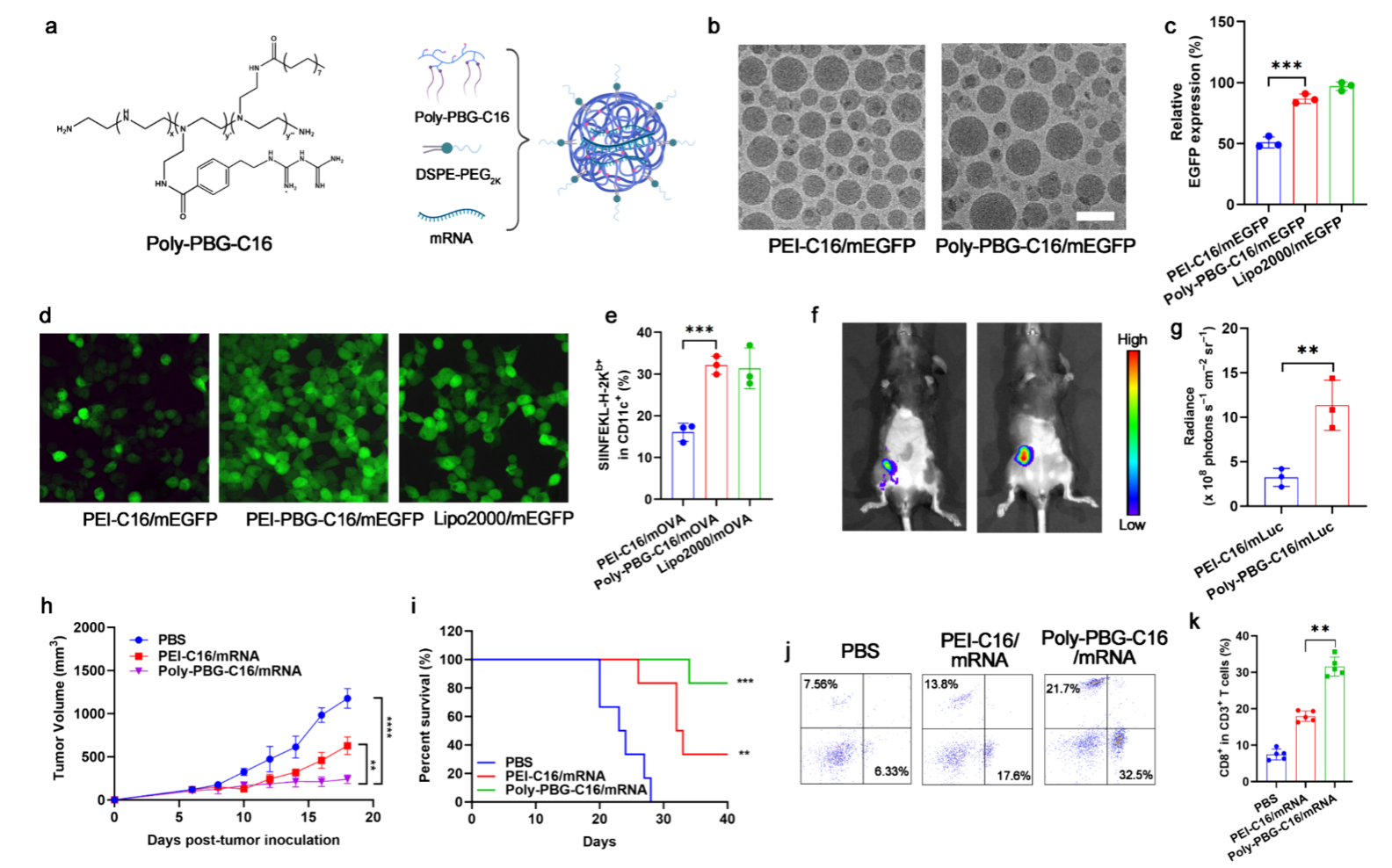 为了扩大基于PolyGu的自佐剂的用途,作者探索了基于Poly-PBG的mRNA载体效果。 以OVA mRNA作为模型,并使用十六烷酸(C16)将Poly-PBG修饰为Poly-PBG-C16,以提高mRNA的递送效率。 作者制备了 EGFP mRNA (mEGFP) NV,并使用 HEK-293T 细胞进行体外转染实验。 体外转染显示,Poly-PBG-C16可接近Lipo-2000的效率。 以mOVA NVs 考察了 BMDC 细胞模型中的抗原呈递效果,结果表明 Poly-PBG-C16 促进了抗原表达和呈递。 此外,用 Poly-PBG-C16/mOVA 免疫小鼠可诱导适应性免疫反应,显着抑制肿瘤生长,表明这种基于胍的佐剂材料可以作为 mRNA 疫苗的有效载体。