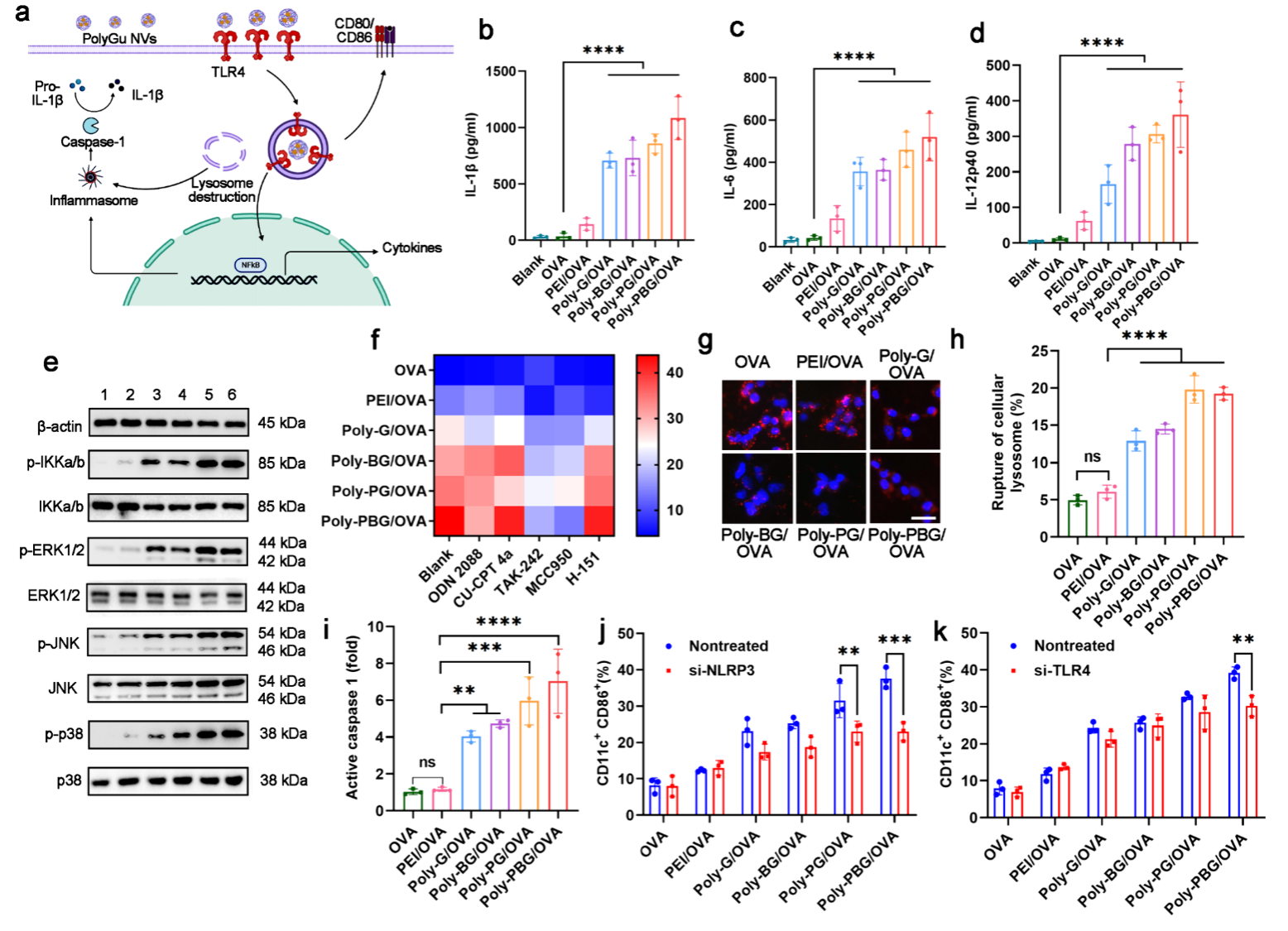 作者猜想这些富含阳离子的PolyGu NVs可以激活细胞内模式识别受体,从而促进DCs的成熟并通过下游信号通路促进抗原呈递。 因此,作者首先测量了经 PolyGu NV 处理的 DC 的细胞因子分泌情况。 结果显示,PolyGu NV 显着增强 DC 分泌 IL-1β、IL-6 和 IL-12。 因此,作者推测PolyGu NVs对DCs的激活主要是通过丝裂原激活蛋白激酶(MAPK)途径实现的,并通过蛋白质印迹实验进一步验证了这一点。此外,利用几种典型的TLR和STING抑制剂进行验证,结果显示,TLR4抑制剂和NOD样受体3(NLRP3)抑制剂显著减少了PolyGu NV对DC的激活。