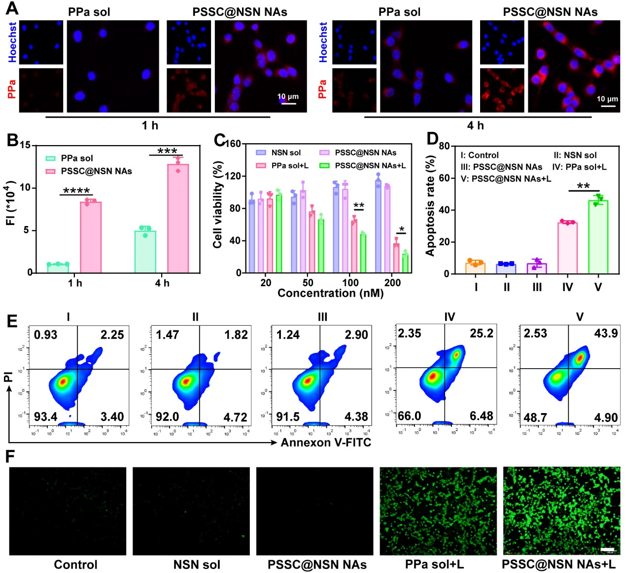 作者接着考察了超分子纳米组装体的细胞摄取行为及体外抗肿瘤作用。结果表明,相比于PPa溶液剂,纳米组装体具有更高的细胞摄取效率,并显示出显著增强的细胞毒性、显著促进了细胞调亡与胞内ROS产生(图4)。