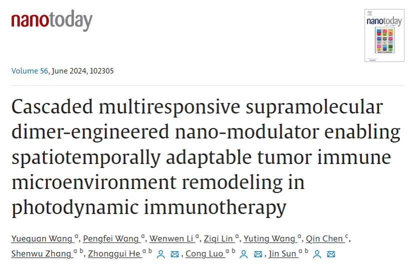 2024年5月6日,bv伟德中国官方网站何仲贵/孙进/罗聪团队在爱思唯尔旗下期刊《Nano Today》(IF=17.4)发表题为“Cascaded multiresponsive supramolecular dimer-engineered nano-modulator enabling spatiotemporally adaptable tumor immune microenvironment remodeling in photodynamic immunotherapy”研究型论文,公司bv伟德孙进教授、罗聪教授和何仲贵教授为本文通讯作者,2021级博士生王悦全为本文第一作者,bv伟德中国官方网站为第一通讯单位。