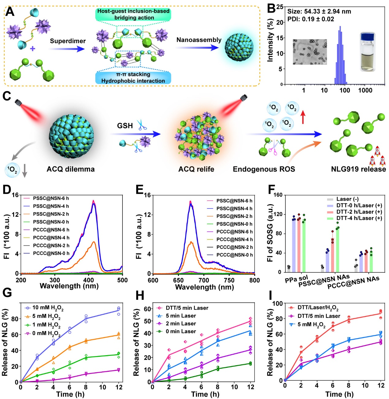 接下来,作者考察了超分子纳米组装体的时空可控的级联药物激活,结果如图3所示。在还原环境中二硫键断裂促进超分子纳米组装体解体有效缓解了PPa的ACQ效应,产生1O2能力显著增强,而H2O2的加入和近红外照射均能够使NSN中的单硫键断裂,实现NLG919的释放,并且呈现时间依赖性。进一步地,同时加入H2O2和进行近红外光照射能够进一步加速NLG919的释放,并且在与DTT共孵育后缓解ACQ效应后再联合H2O2和近红外光照射后显示出更高的释放速率,实现了时空级联药物激活。