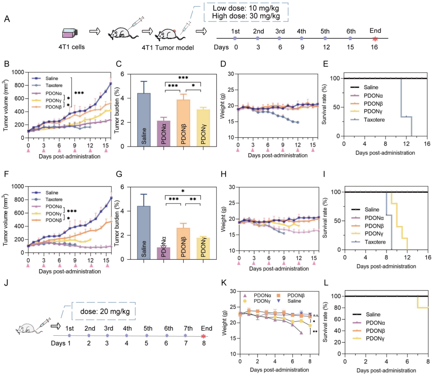 结果表明,二硫键和酯键之间碳数最少的前药纳米组装体PDONα可在体内快速激活并转化为多西他赛,其抑瘤效果可与市售制剂Taxotere®相当。但由于响应模块过度敏感,PDONα带来了一定的系统毒性。碳数居中的PDONβ虽然具有最佳的药代动力学行为和肿瘤选择性,但由于其响应模块的敏感性不足,未能发挥有效的抗肿瘤活性。碳数最多的PDONγ表现出了中等的转化效率和抗肿瘤作用,但在体内实验中发现其存在较大的致死风险。这项研究表明了在前药开发中合理筛选响应模块的重要性,为前药纳米组装体的合理设计提供了参考。