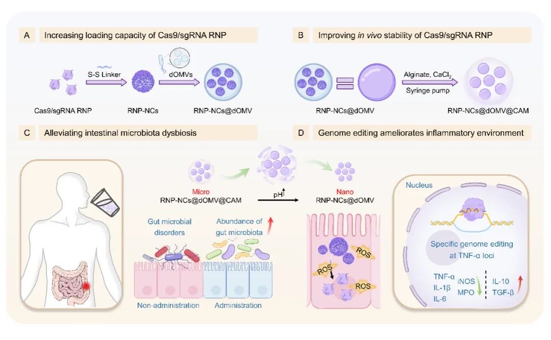 该研究如同发现了一种能够精准定位并修复基因的“微型手术刀”。通过巧妙的纳米封装技术,他们将CRISPR-Cas9技术转化为一种口服系统,实现了精准的基因“修复”。这种口服微纳基因编辑系统,旨在通过靶向肠道中过量的TNF-α,实现对IBD的特异性基因治疗(图1)。该系统通过二硫键桥接Cas9/sgRNA核糖核蛋白(RNP),将其组装成纳米簇(NCs)。这些RNP-NCs随后被封装在源自大肠杆菌Nissle 1917的可靶向炎症细胞的去脂多糖外膜囊泡(dOMVs)中,进一步被一层钙藻酸盐微球(CAMs)所包裹。借助CAMs的保护作用,口服给药系统能够在进入胃部时抵抗胃酸降解,实现对肠道的高效靶向输送。随着pH值逐渐升高,微米级的CAMs溶胀破裂,释放出封装在dOMVs中的纳米级RNP-NCs到肠道中。这些RNP-NCs@dOMVs能够穿透粘膜屏障,靶向炎症性巨噬细胞,并在其中条件性激活Cas9/sgRNA RNPs,有效进行TNF-α基因的基因组编辑。这样的口服微纳基因编辑系统为IBD的治疗提供了一个充满希望的转化平台。
