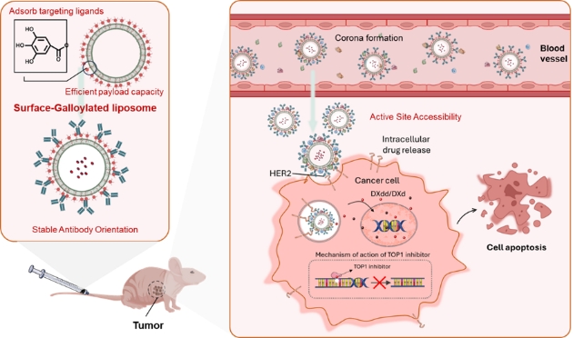 在肿瘤治疗和精准药物递送领域,靶向纳米载体因其高选择性和疗效潜力而备受期待。然而,蛋白冠效应会掩盖表面修饰的配体,导致靶向性丧失;同时,传统的抗体化学偶联工艺复杂,存在免疫原性风险和产业化障碍。这些瓶颈长期阻碍了主动靶向纳米药物的临床转化。近日,bv伟德王永军教授团队在Nature Communications发表研究成果,报道了一种基于没食子酰基修饰脂质的表面没食子酰基化脂质体(Galloylated liposomes, GA-lipo)。该体系通过非共价方式稳定吸附抗体,实现抗体Fab端定向暴露,且不受蛋白冠遮蔽影响,在动物模型中验证了该策略的高效靶向递送和显著抗肿瘤疗效。
